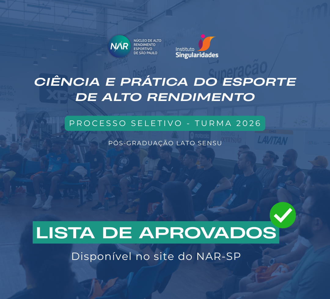 O NAR-SP tem a satisfação de anunciar os aprovados na 4ª turma da pós-graduação “Ciência e Prática do Esporte de Alto Rendimento”, realizada no formato híbrido. O processo seletivo recebeu 128 inscrições, alcançando uma média de 2,13 candidatos por vaga.